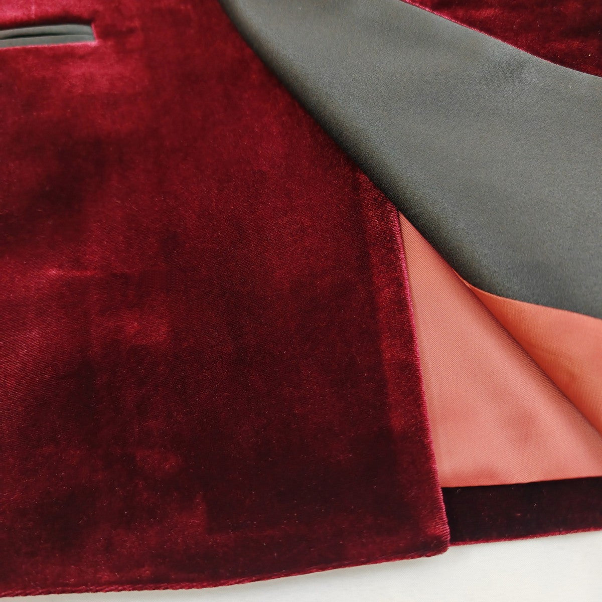 Prepárate para ser el centro de atención con nuestro elegante esmoquin cruzado burdeos. Esta elegante chaqueta luce una elegante solapa de satén negro que le da un toque sofisticado a tu look. El cierre cruzado le da un toque clásico y atemporal, perfecto para ocasiones formales o eventos especiales.