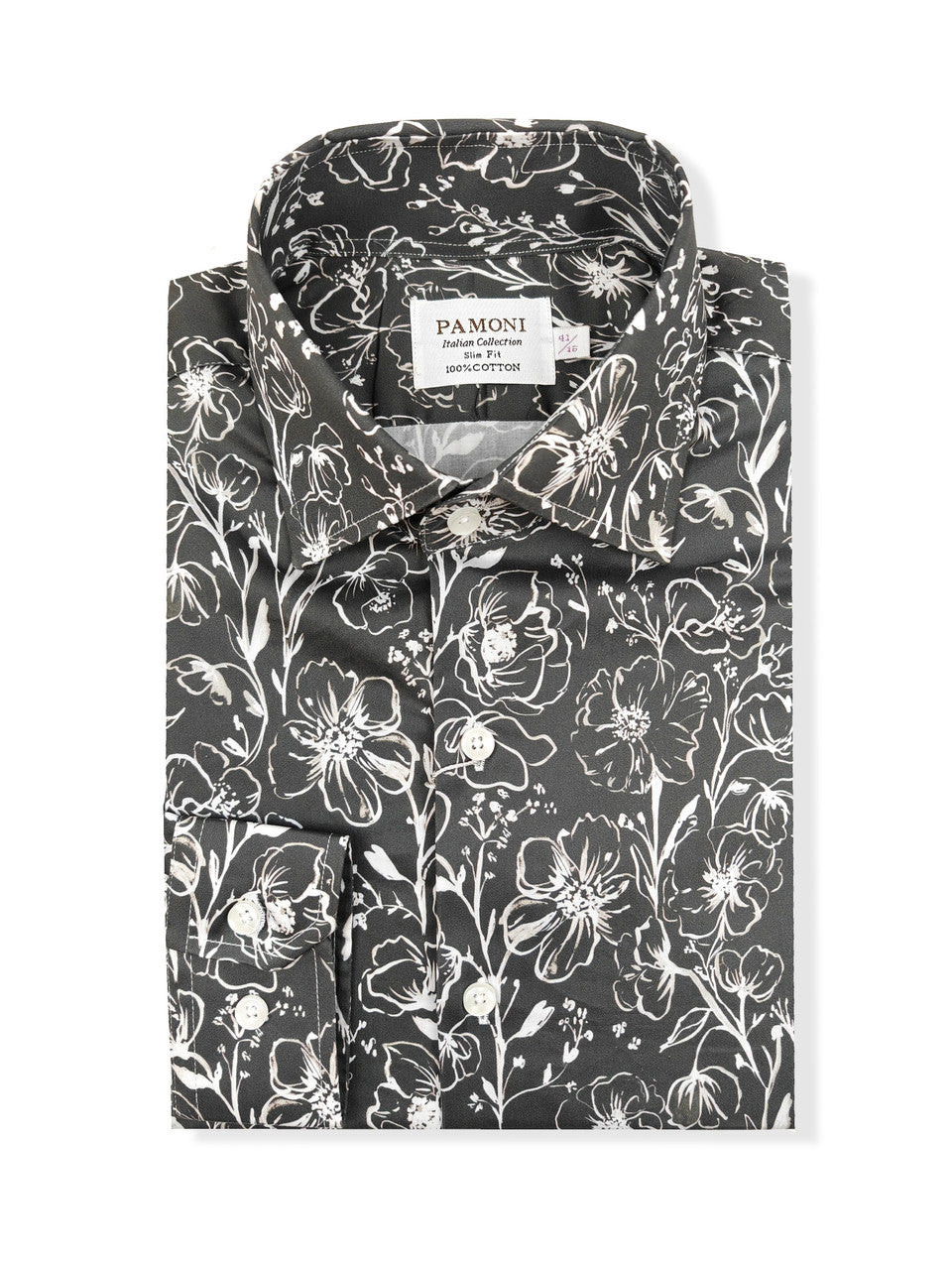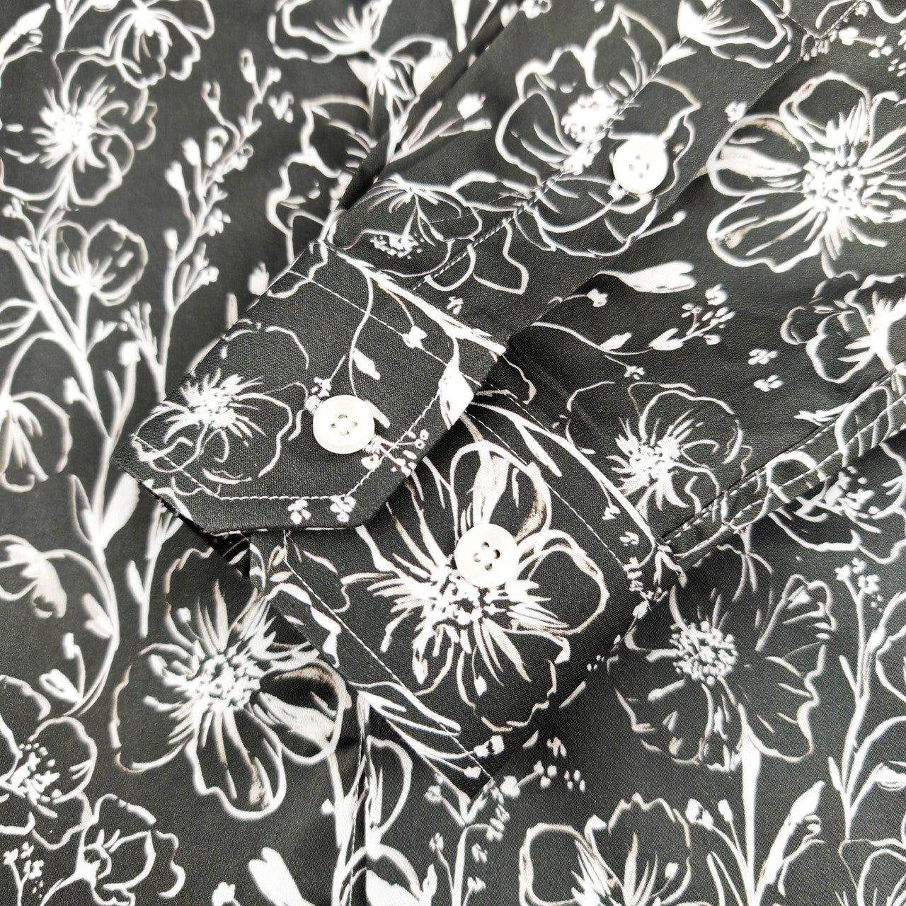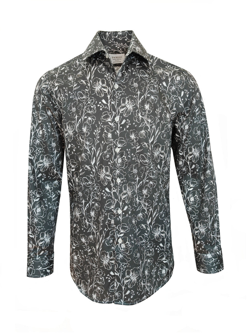 Esta camisa de corte entallado para hombre presenta un elegante estampado floral monocromático en blanco sobre fondo oscuro. Sus características principales incluyen: