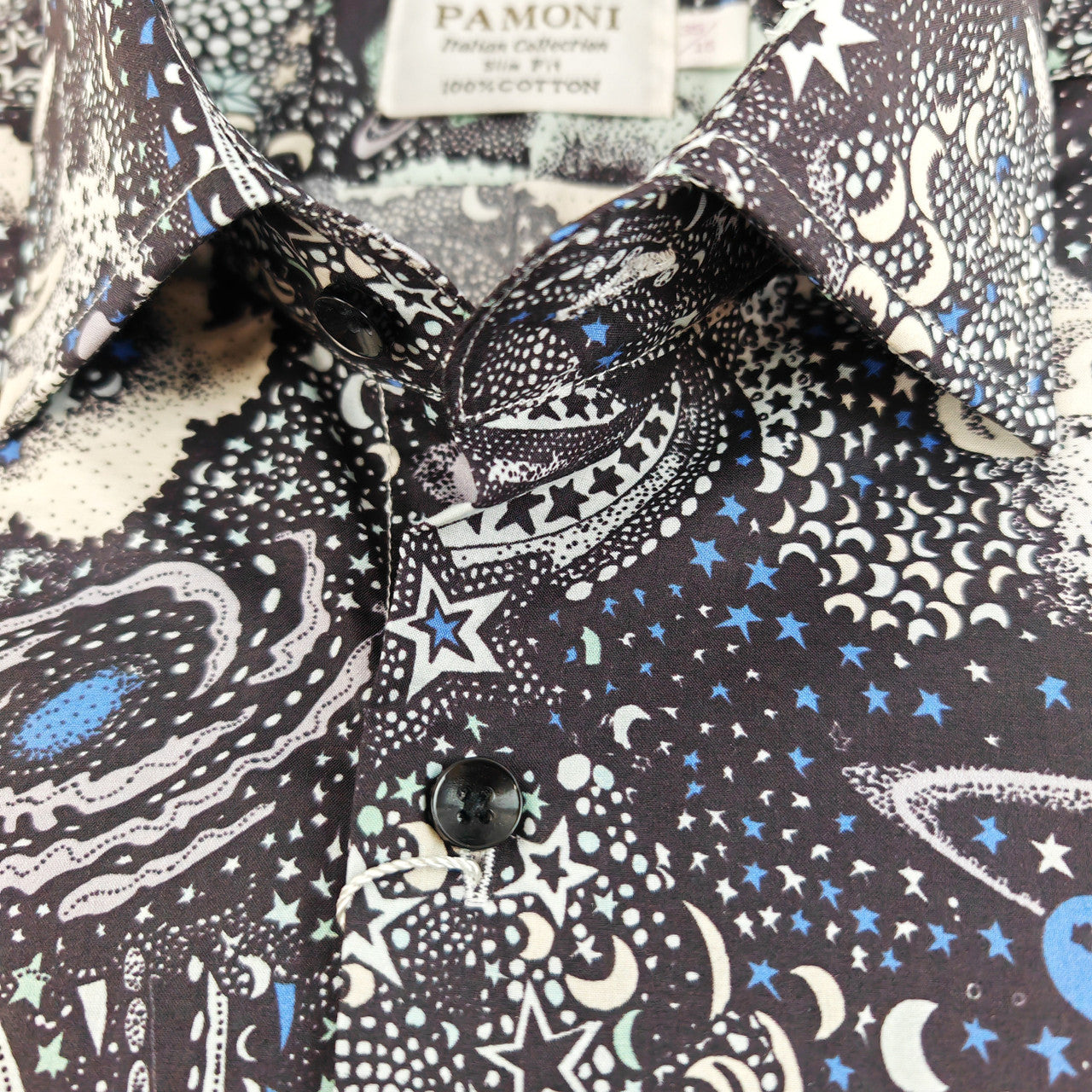 L'imprimé floral noir et blanc saisissant, associé au motif hypnotique de l'univers, crée un style unique et captivant. Portée avec un jean pour un look décontracté ou avec un pantalon pour une allure plus sophistiquée, cette chemise ne manquera pas d'attirer les regards.