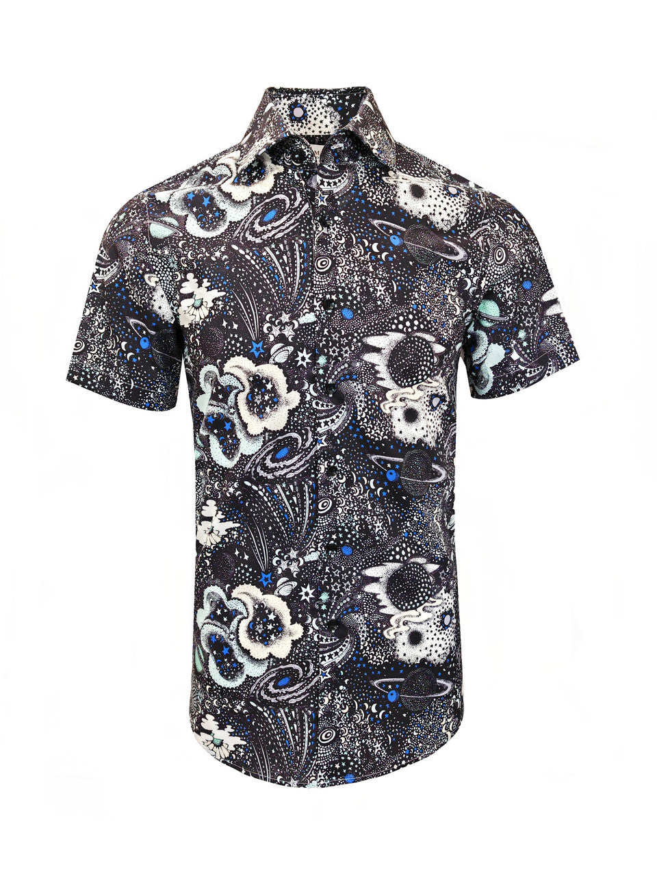 Rehaussez votre garde-robe décontractée avec notre chemise à manches courtes pour homme à imprimé floral noir et blanc, ornée d'un motif captivant représentant l'univers, confectionnée en coton ultra-fin et léger pour un confort et un style ultimes.
