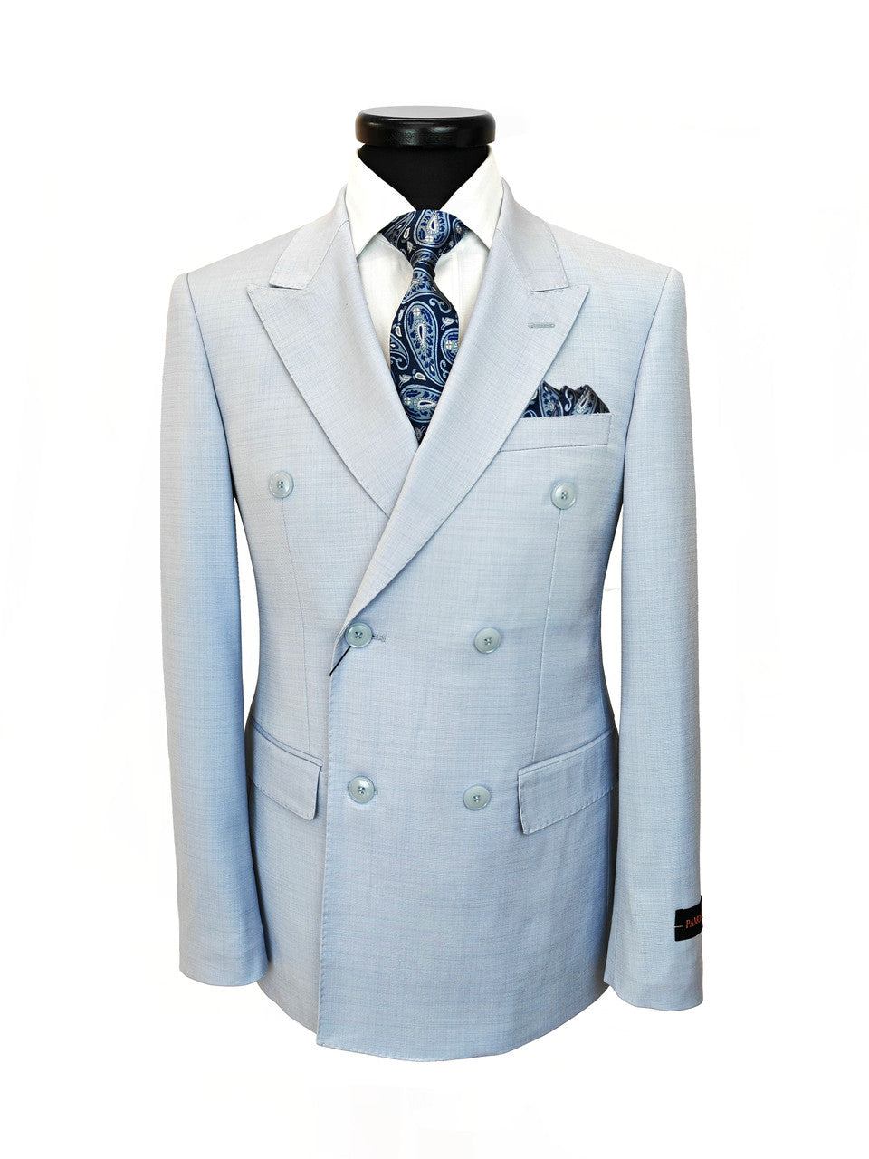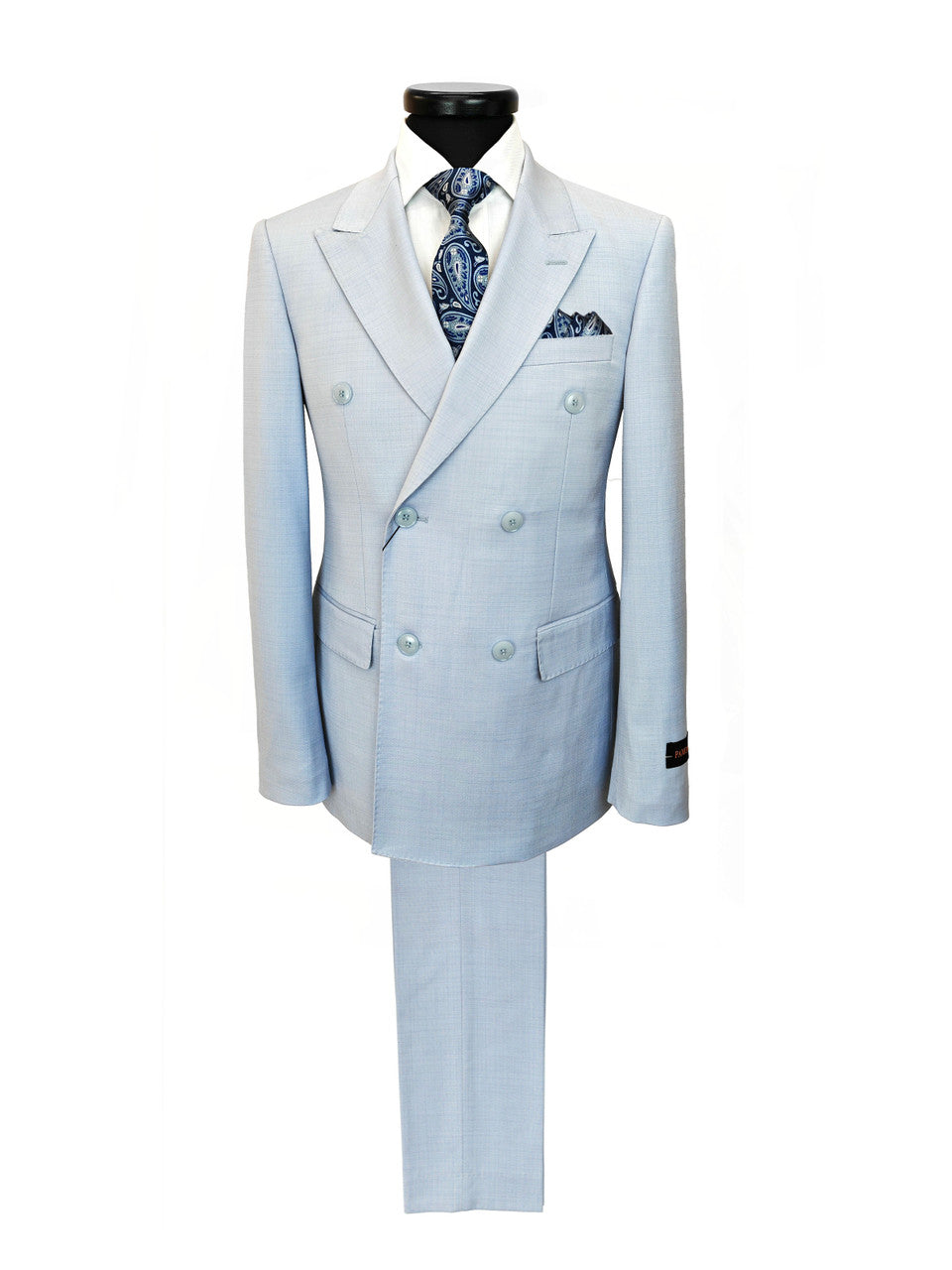 Description: Ce costume croisé bleu clair est confectionné dans un mélange de laine raffiné, alliant style et confort. Sa coupe...
