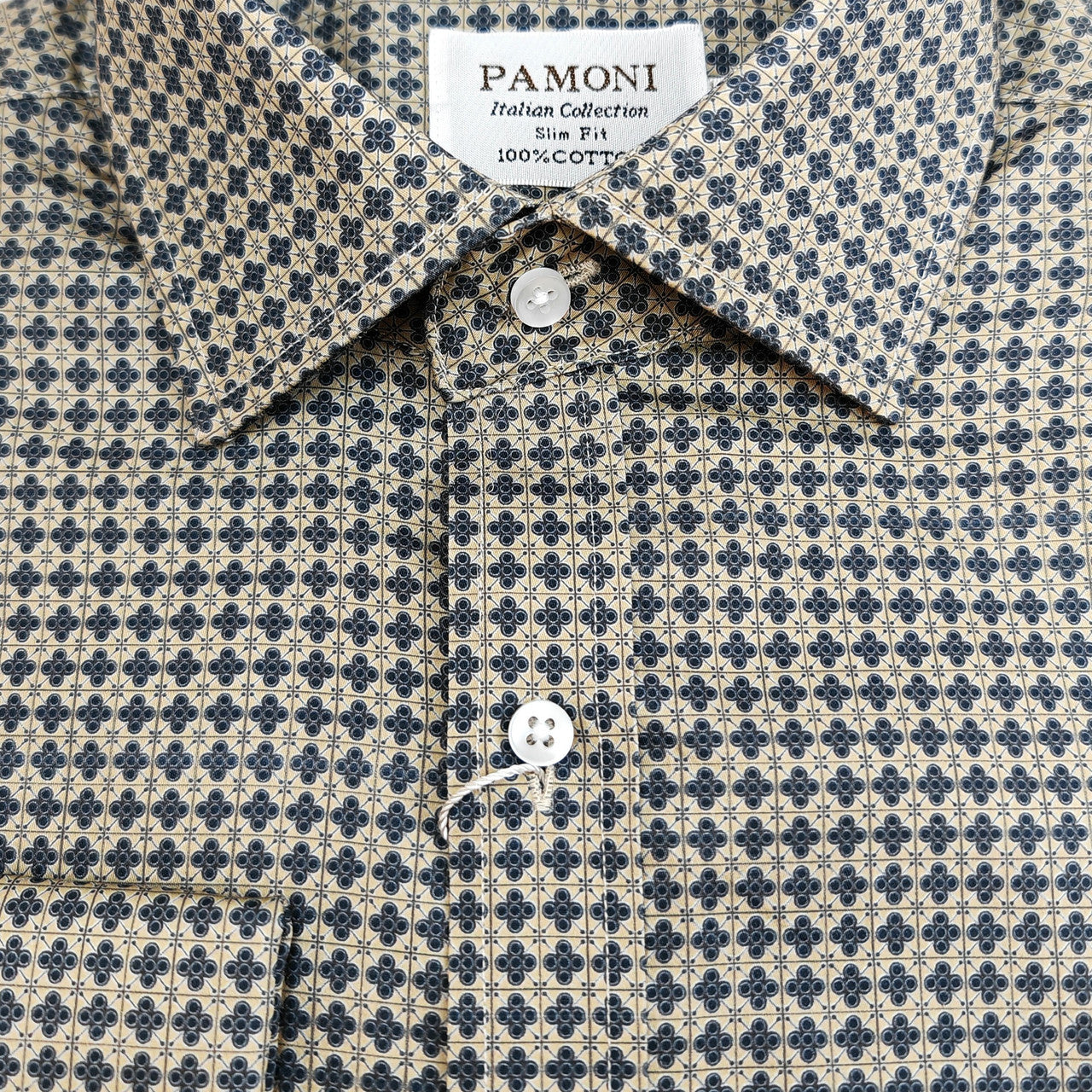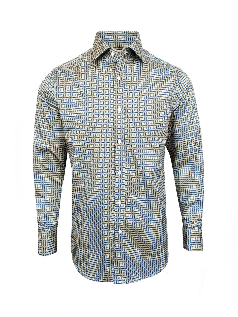 Chemise homme beige et marine à imprimé géométrique, coupe ajustée, poignets mousquetaires, 100 % coton