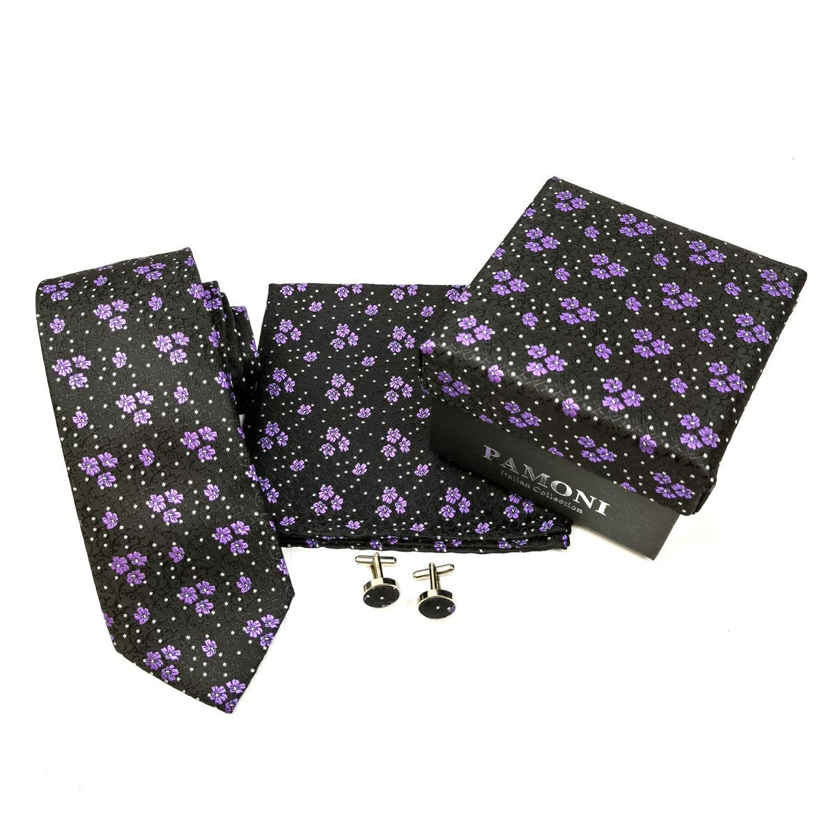 Ensemble cravate et boutons de manchette à motif lilas noir