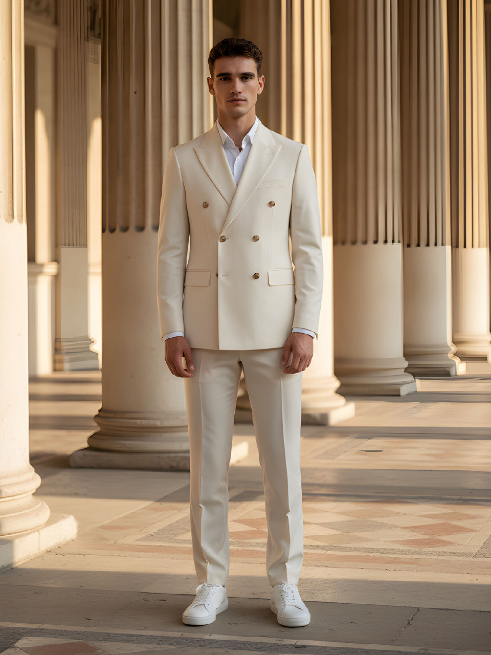 Costume homme coupe slim, croisé, en laine mélangée crème avec boutons dorés