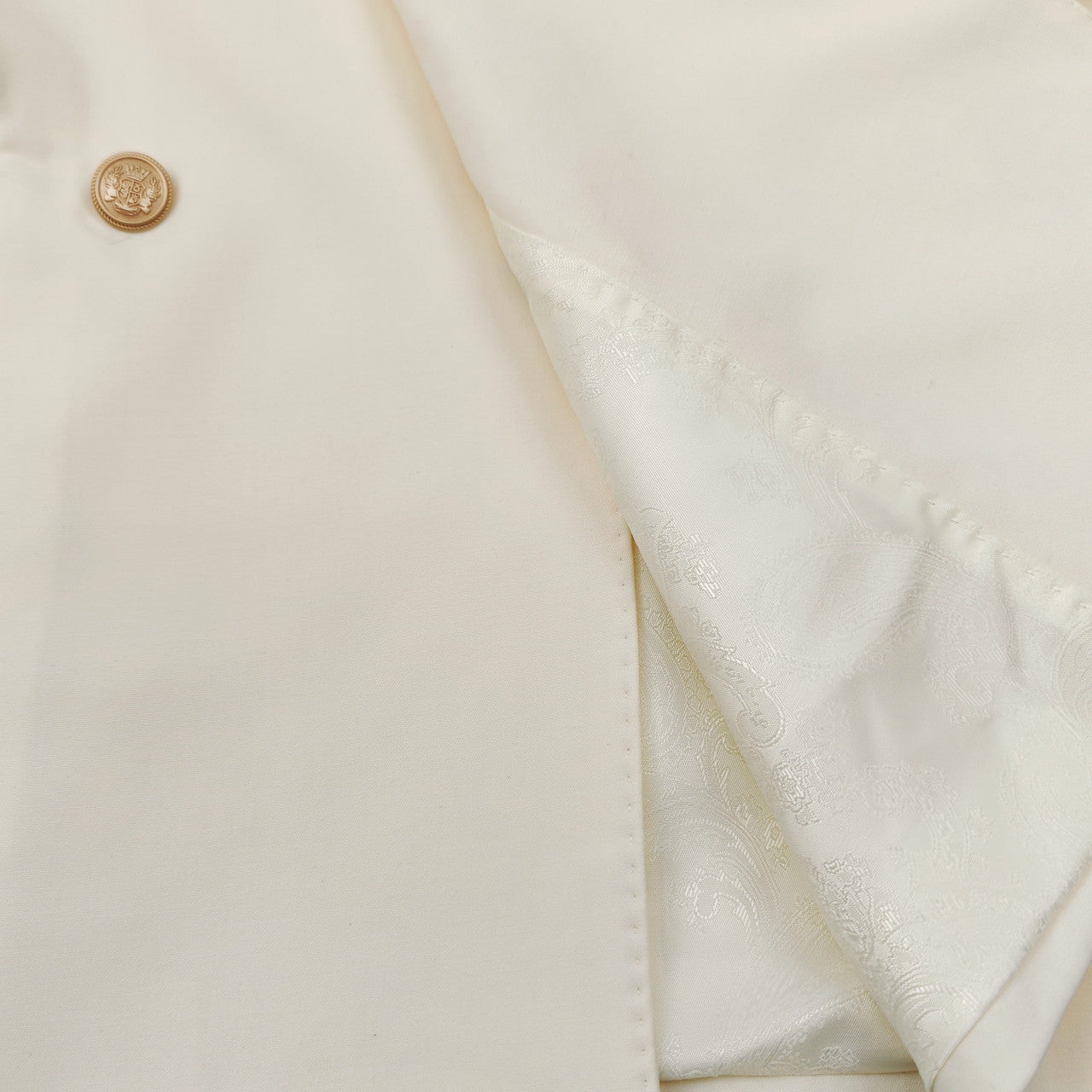 Rehaussez votre garde-robe formelle avec ce costume croisé crème raffiné, à la coupe ajustée et élégante, pour un style contemporain et raffiné. Confectionnée dans un mélange de laine de qualité supérieure, la veste est ornée de boutons dorés sophistiqués qui ajoutent une touche de luxe et de distinction.