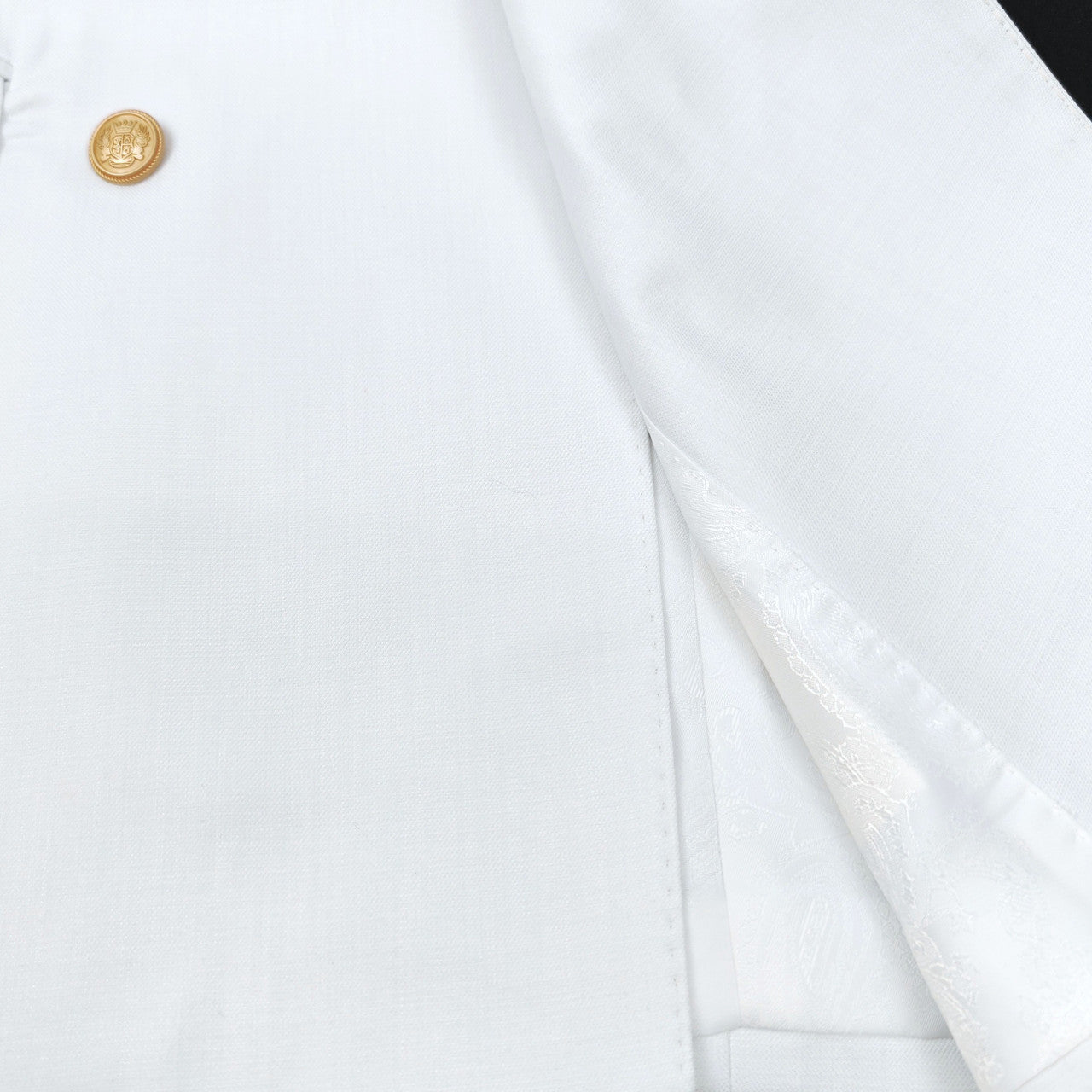 Affirmez votre style avec audace et élégance grâce à ce costume blanc croisé , à la coupe ajustée pour une silhouette moderne et élégante. Confectionnée dans un mélange de laine de qualité supérieure, la veste est ornée de boutons dorés du plus bel effet, qui rehaussent son allure raffinée et luxueuse.