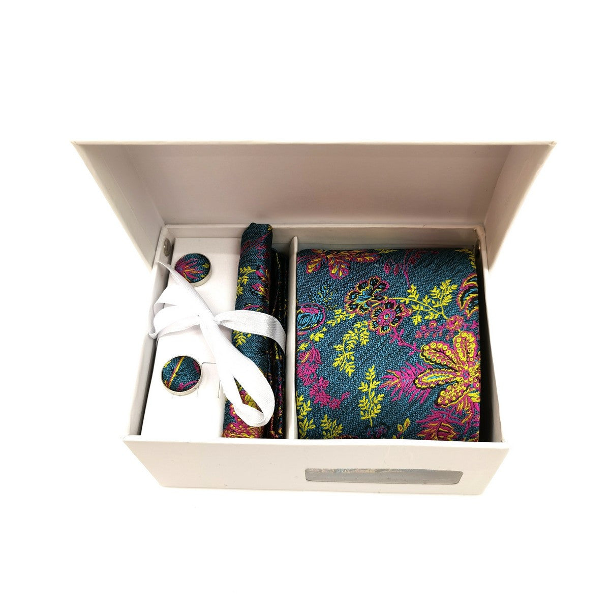 - Ensemble cravate et boutons de manchette comprenant une pochette et un coffret cadeau