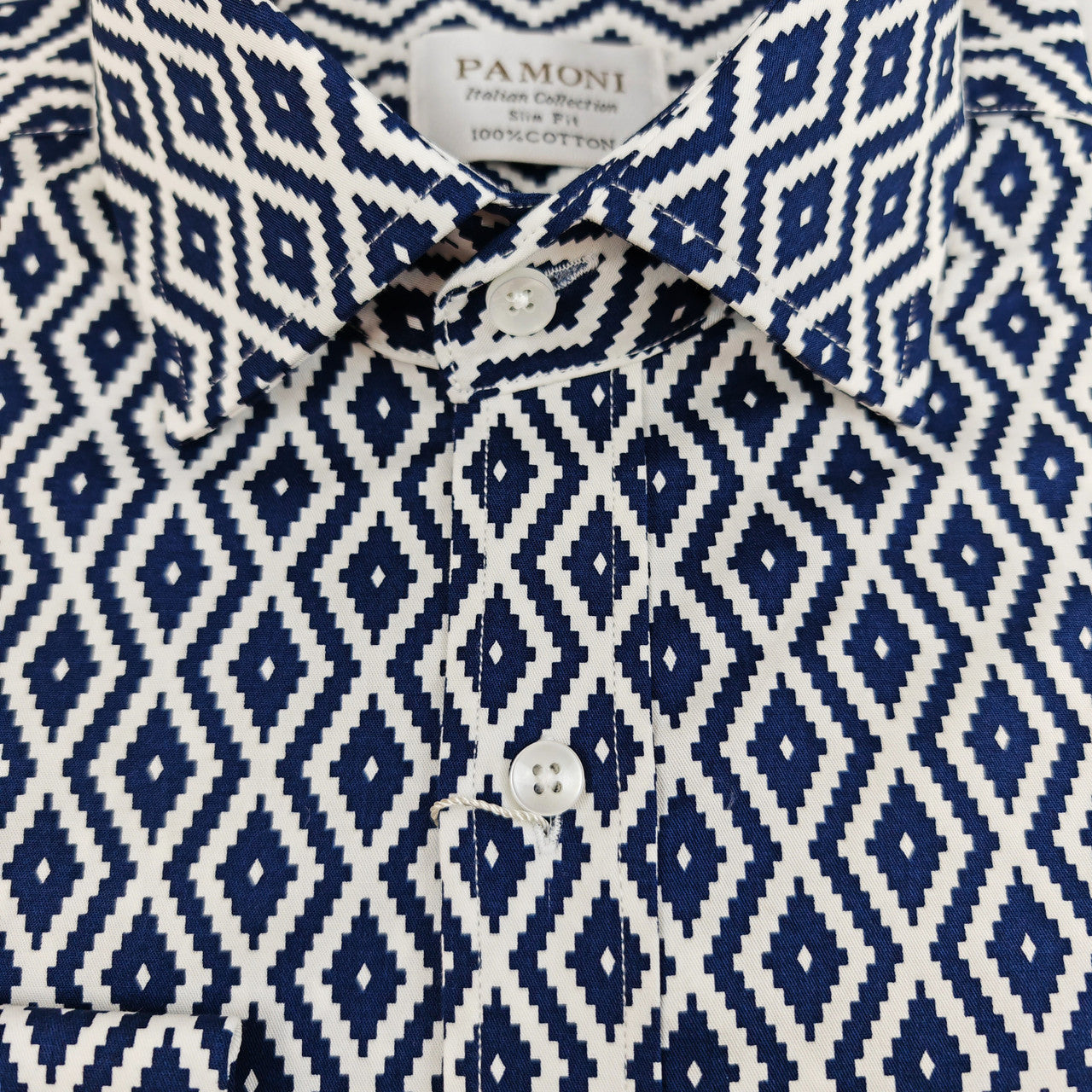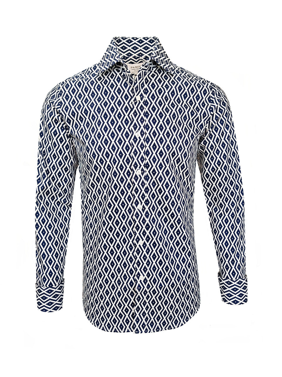 Adorned with a distinctive navy diamond chevron print, this shirt exudes contemporary flair and individuality, making a bold statement wherever you go. Whether paired with tailored trousers or jeans, it adds a refined edge to any outfit.